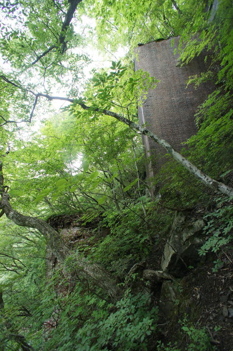 どう見ても崖です。どうやって造ったのでしょう。 ネットで昔の写真が出ているのを見ると、ひた すら木組みを積み上げて支保工にしたようです が、本当に途方もない事業だったことでしょう。 どう見てもここからでは登れません。少し回り 込むか… |