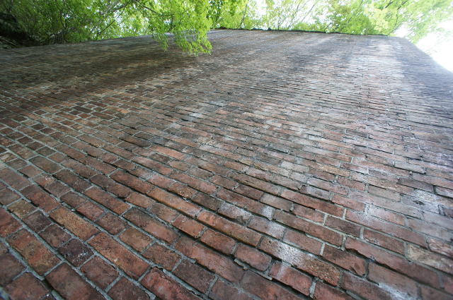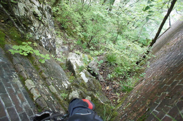 時間にしてほんの数秒でしょう。 しかし、煉瓦の壁頭頂部に手をかけるまで、 かなりの時間を感じました。 冷汗が出ます。 片手をかけ、安全を確認してから下向きに 撮影。ふう…怖かった… ここから降りるのはいややな… |