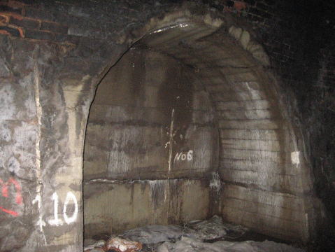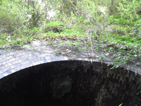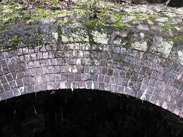 6層の多層巻き煉瓦アーチ。坑門の石積みはアーチ状に1層のみで、後は岩盤と一体化しています。 |