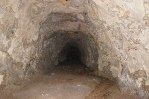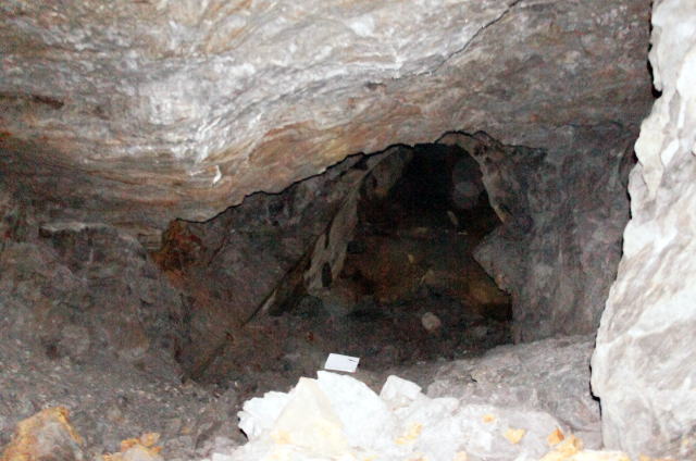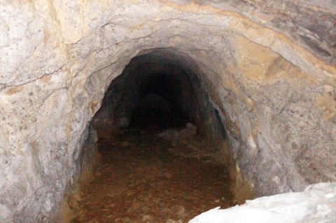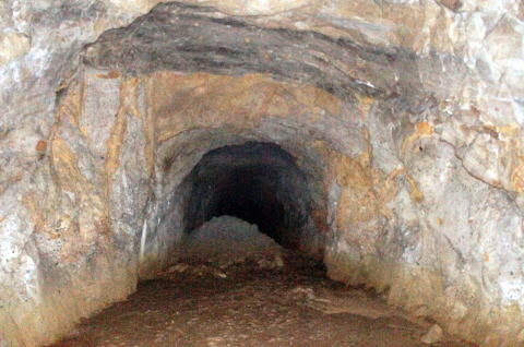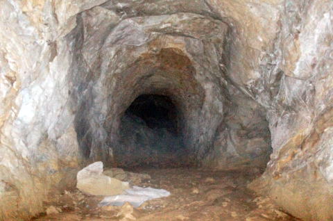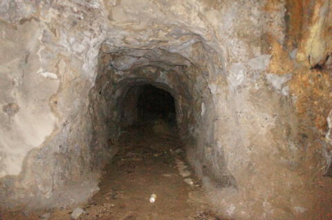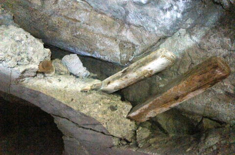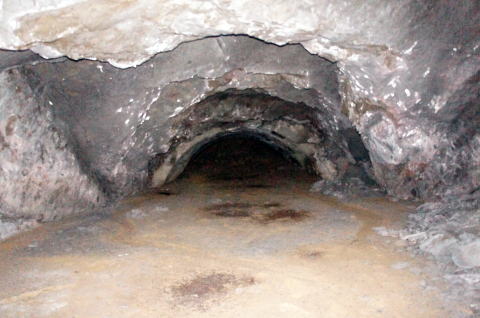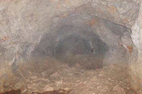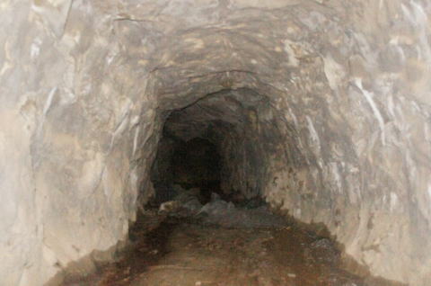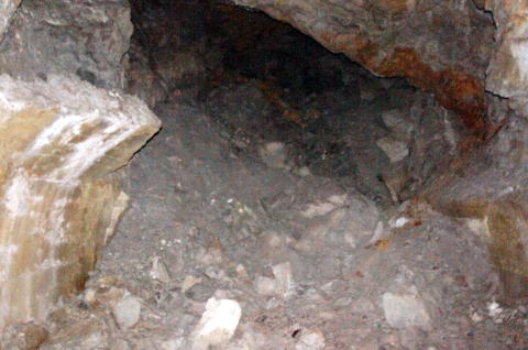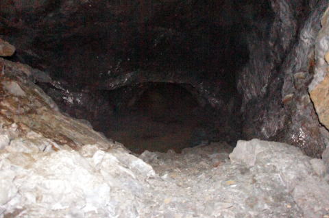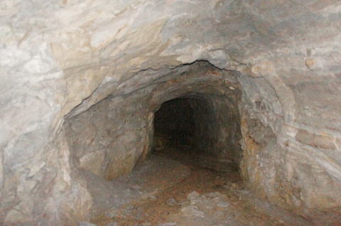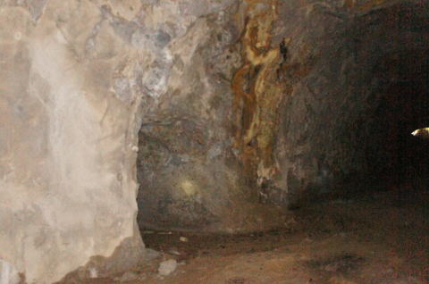その前に横坑振り返り。 だいぶ荒い掘削跡です。 路面には水が流れたような跡があります。 雨天時には水が流れるのかもしれません。 |