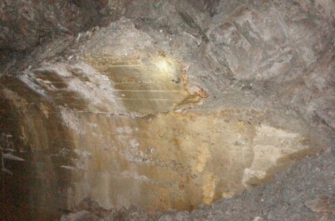 岩盤とコンクリアーチの隙間に角材が刺さって います。。。 これはコンクリートアーチを施工する際に使われ た支保工の残骸でしょうか。 本来こんなの残さないんですがねえ。。。 |