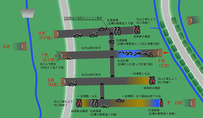 ![]() Copyright(c)2011,ピカ氏 さあお待ちかねのピカさんマップです!坑道ナンバーを整理していただきました。 4本中一番南側の隧道を、東側の開口部から想定してD坑に。西側N坑東側が不明の隧道をE坑に。 最初に潜入した東側E坑と西側O坑を統合、番号整理してF坑に。西側P坑東側消滅?の隧道をG坑に、 それぞれ改称致しました! さらに内部の状況も事細かにマッピングしていただいております!これ以上の詳細マップがありますか!? というわけで、次回は新E坑の東側確認、D坑東側潜入、そしてついに道路を挟んで東側へ突入します! 以降、 その4 に続く! |