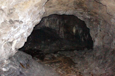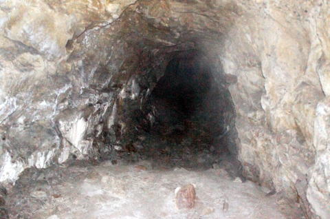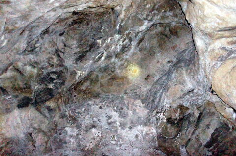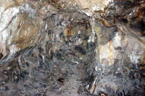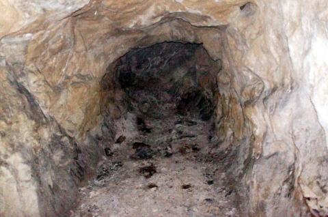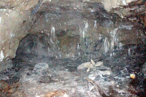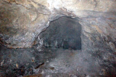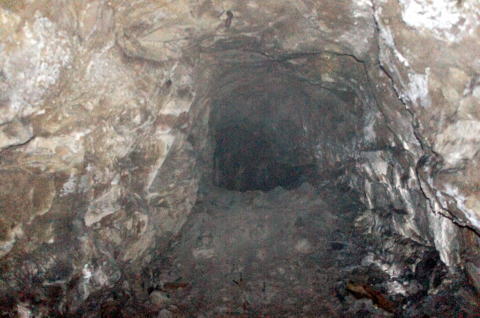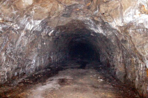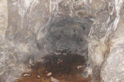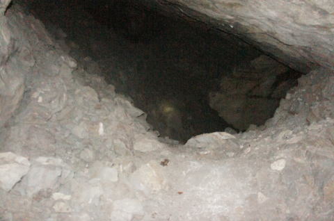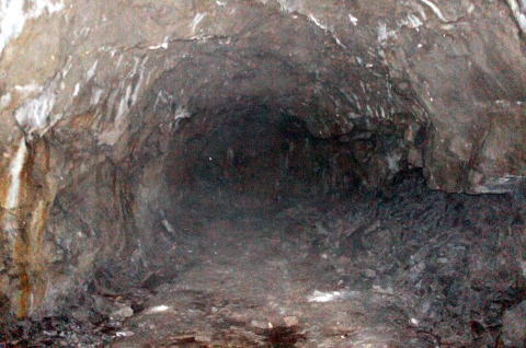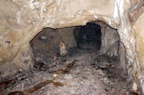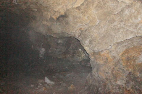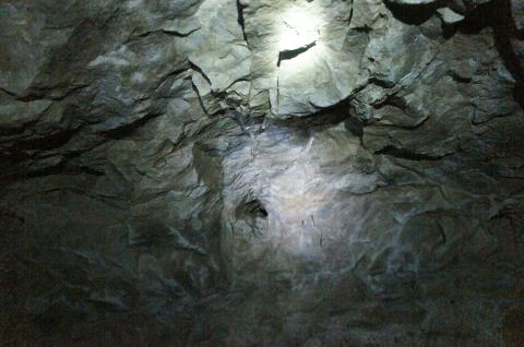 まず右側は。。。 ありゃあ〜すぐ行き止まりです。 端点にはダイナマイト充填用の穴が開いて いるため、ここも掘りかけのようです。 |