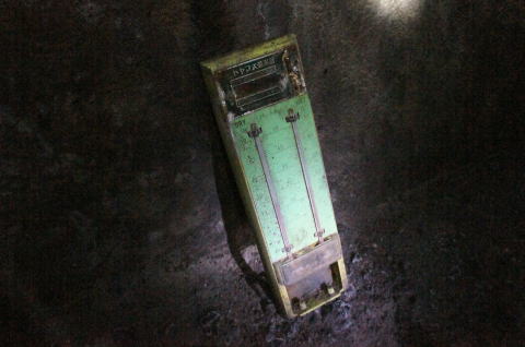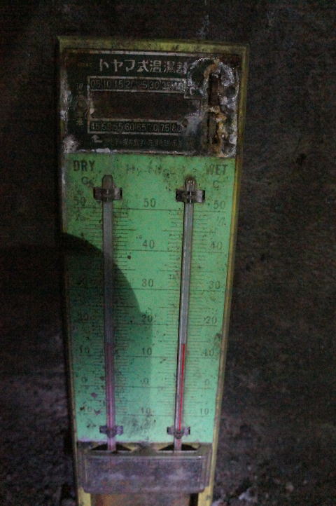 さあ、横坑!とK坑を戻っていた時に。。。 発見!!! これは温度計!? 「トヤマ式温湿計」と記載があります。 これは調べてみないと!ってなわけでネット で確認すると。。。 |