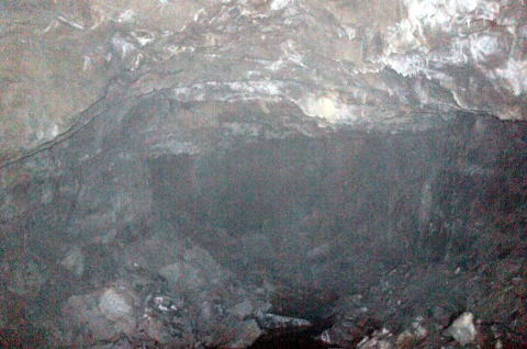 L坑!取りあえず東の端点を確認しま しょか! 靄がきつ〜い! 崩落を乗り越えると、また空間は広がります が、とにかく靄がきつい! 果たして端点は残存するのか。。。 |