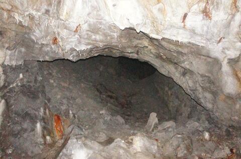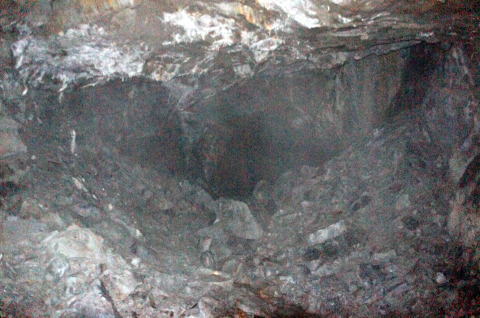 まあ取りあえず、K坑の端点の確認を優先し ます。 しかし先の3本と違って崩落が少ないなあ。 って、奥の様子が。。。 |