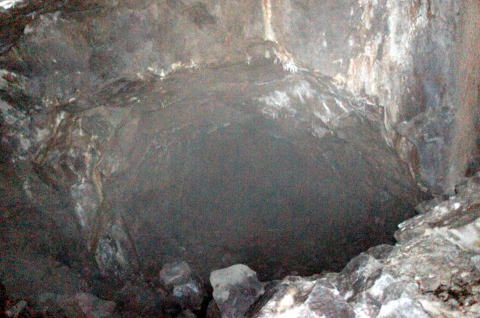 うむむ。。。やや下向きに穴が開いています。 どうやら本坑からの土砂の流入があるようで す。 |