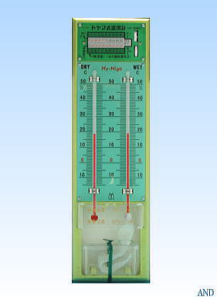折角なんで、(温湿計)乾湿計に関する学習 をしてみましょう。 ※以下全て安藤計器製工所様HPの文章を 拝借しています。 ★乾湿計★ 木やプラスチックなど一枚の板に、2本の棒状 温度計を組み合わせたもので、乾球と湿球(感 温部に水でひたしたガーゼが巻いてある)の温 度をはかり、その温度差から百分率による相対 湿度を求めるものです。 〜用途〜 ・気象の観測用 ・住宅・事務所等室内の湿度測定、調節用 ・養蚕室、貯蔵庫、美術品展示室等の湿度、 空気の調整用 〜取り扱い方〜 一般用、業務用色々な使いみちがあり、乾 球と湿球の温度差より湿度を求める方法に、 換算表を使うものと、簡単に直読出来る方式 のものなど色々なタイプのものがあります。 取扱い上の注意事項は、室内用温度計と 同じですが、特に湿球のガーゼと水は常にきれ いな状態にしておきましょう。なお、水槽の水を 交換したり、補充するときは、ガーゼを通して水 分が湿球に充分ゆきわたっているか否かを確 かめて下さい。 又、ガーゼは使用する場所にもよりますが、 少なくとも半年に一度は交換するのが望まし く、ガーゼを交換するときは一重に巻いて下さ い。湿球温度計の示度が正しい値になるまで には約15分かかります。ご注意ください。 戦後、何かの用途(貯蔵庫?)で使われた際 に使用されていたブツではないかと。でも湿の 字が旧字体なのがいい味を出しています。 |