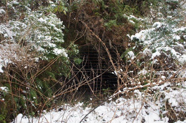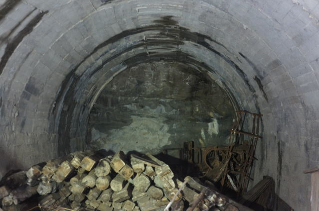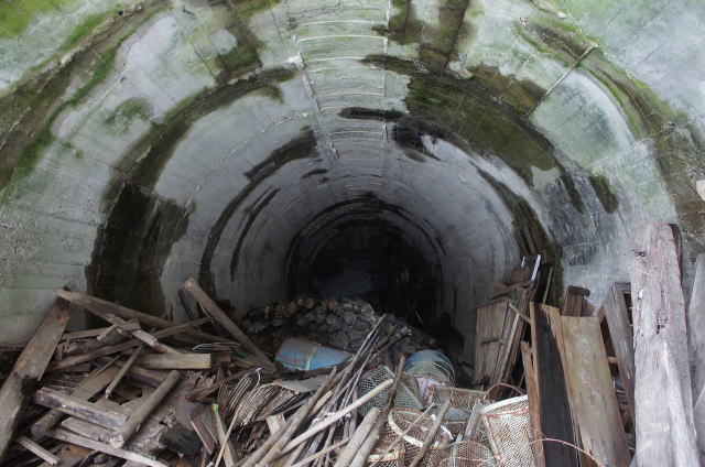 ![]() I坑の坑口のコンクリ巻き…をいをい…やっぱり巻き立ての方が恐ろしい… 戦時中とはいえ、無筋アーチとは何を考えているんでしょうか。やはり究極の鉄不足に陥っていたんでしょうねえ… だから苦肉の木筋コンクリートも生まれたわけですな。 |