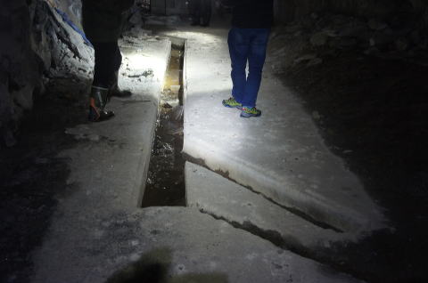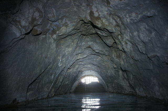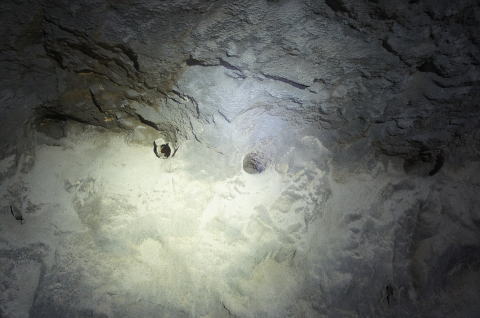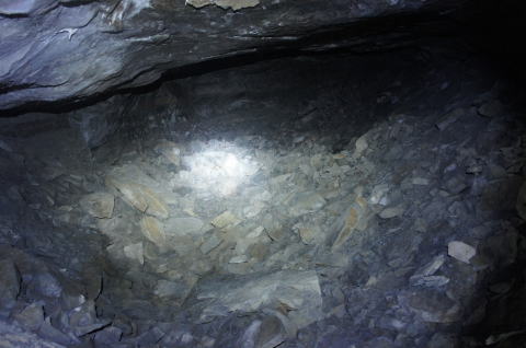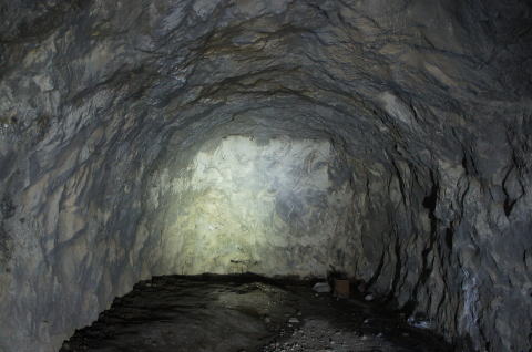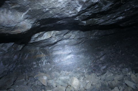 ![]() 最深部より振り返り。 このような感じで洞内が掘りあがっているのが分かって頂けると思います。 本坑を見下ろすような感じになっています。 |