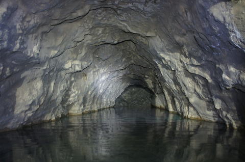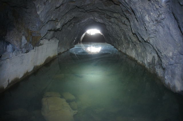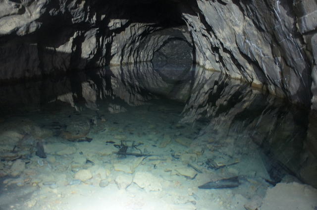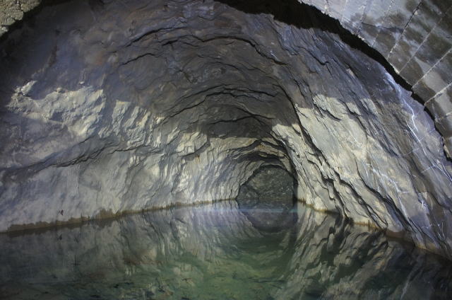 ![]() 水面に映る素掘りの洞内。まるでまん丸の坑道かのようです。 そしてA坑、B坑以外の、あのスカスカコンクリ巻きよりもずっと安心感があります。 …それでは入水… |