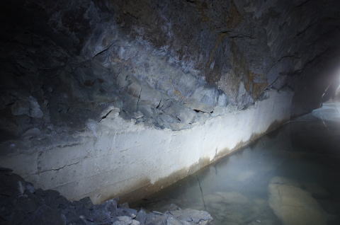 対岸の崩落地点が近づきます。 洞床の瓦礫は多くなく、透明度も高く、そして 何よりコンクリートの感触がはっきりしている んで、足元の不安は全く感じません。 素掘りの洞内、右手にコンクリートの壁が 出てきましたな… |