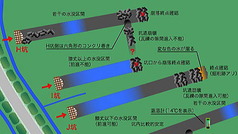 これは以前ピカさんが撮影したH坑からの 横坑映像です。 ご覧のように土砂の流入により、閉塞してい る?ような感じでした。 |