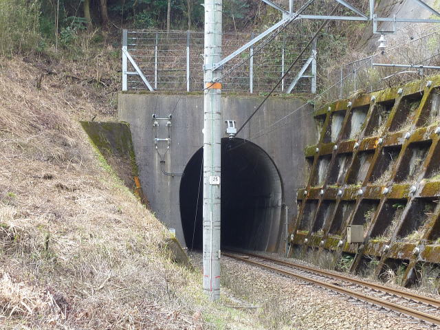 ![]() 1986年7月18日、388.0mのNO.29日出坂トンネルが単線で竣功。 以後の複線化に伴い、上下線のどちらかでこのトンネルを再利用している 模様。南側ポータルはコンクリート改修されていたが、坑門の切石が一部 露出している。 北側不明 |