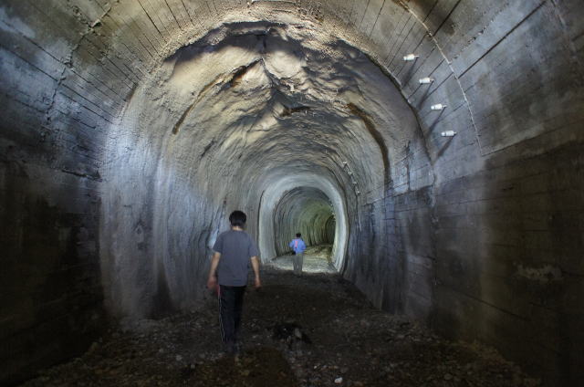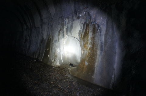 ![]() 閉塞地点から振り返り。 鉄道トンネルでは数が少ない素掘り面を残したままの洞内。地質的に崩落しにくいという判断なのでしょうか。 確かに安定感ありますねえ。 |