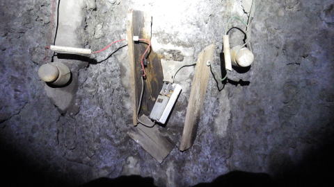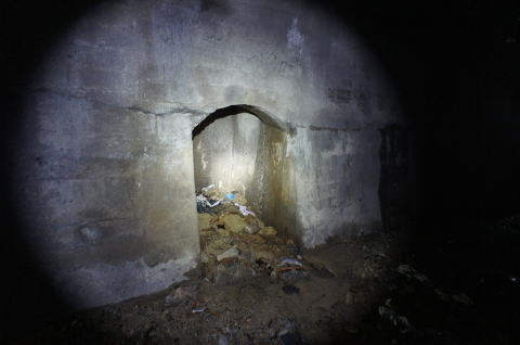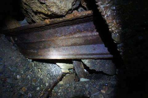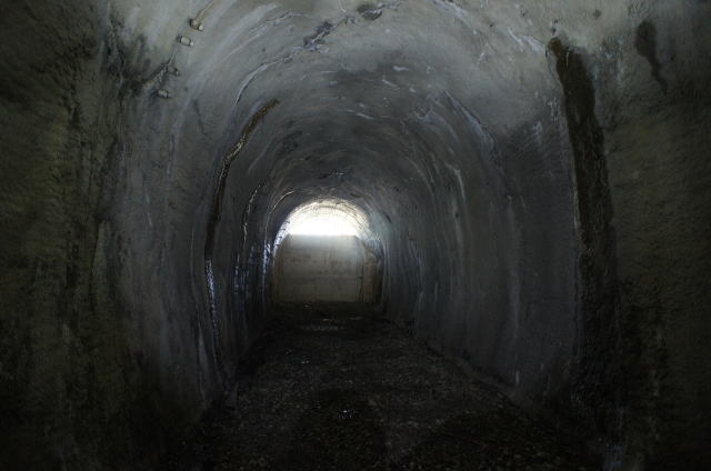 ![]() トンネルは徐々に左に曲がり、薄明りも差してきます。東側も一応開口はしている模様です。 右手に何か設備が残されています。 |