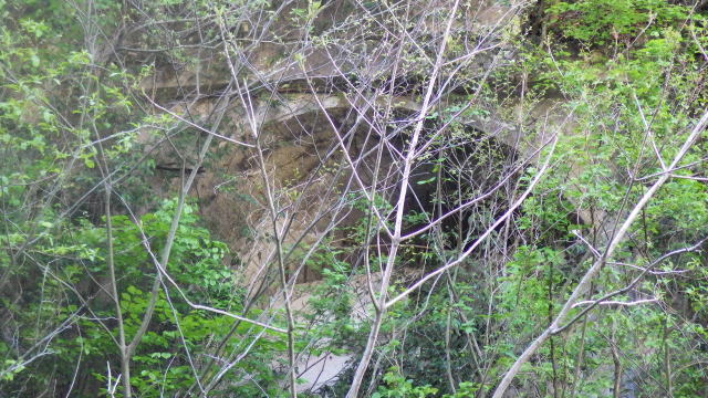 ![]() で…その天狗山トンネルの東側坑口はどこなのか… 実はこんな所にあります…って、え?どこ??? 植生で良くわかりませんが、真正面に開いてます。 因みに右側の穴は違います。あれは廃止された二ヶ用水の水量調節窓です。 |