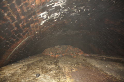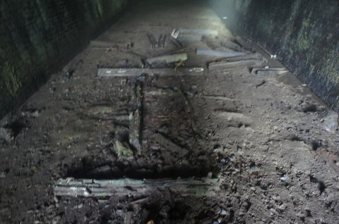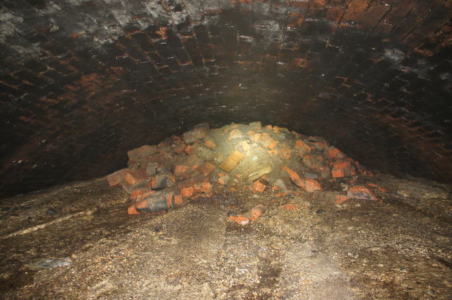 ![]() 鵜飼第一トンネル、完全閉塞現場目視完了 うず高く積もった土砂に何故かこじんまりと煉瓦の破片を盛ってあります。これは自然なのか人為的なのか。。。 おそらく反対側から土砂を押し込んだと思われますが、煉瓦の破片は。。。アーチが損壊している様子も見られませんが。。。 |