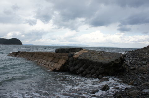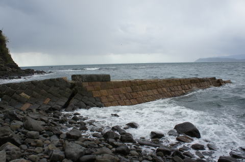 欠円アーチの水路隧道を抜けると即、海に 出ました。 この海に面してもいくつか遺構らしきものが 確認できます。 まずこの石積みの突堤みたいなもの。 |