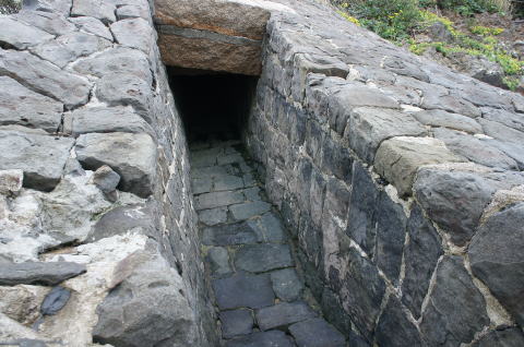 2つある棲息掩蔽部の間、ご覧のような石積み により嵩上げされた空間があります。 上部へはこれまた石積みの階段が左から、 右からはスロープが設置されています。 |