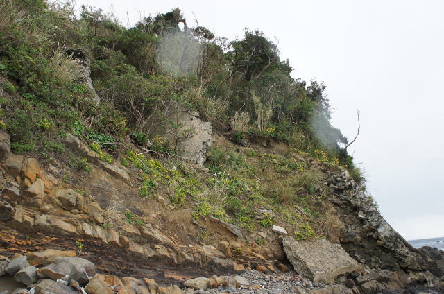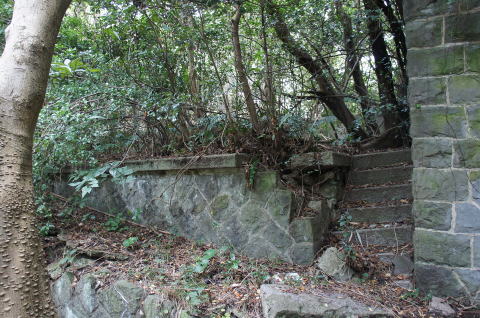 ![]() ちょっと引いて撮影。 どうもここの山肌は崩れてしまっているようです。それによりあのコンクリ構造物も途中で消失している模様ですな。 海に向けて巨大な滑り台のような構造物があったのではないか、と想像します。 その根拠はこちらの資料より→http://www.nwn.jp/kakokizi/20071212/itimen/itimen.html ※ニュース和歌山2007年12月12日号の紙面からのweb抜粋 ちと氏より情報提供 資料から、このコンクリ構造物は水雷の発射座設備の一部ではないかと思われます。 水雷投射施設というのが海面にあったみたいですがそれは確認できません。 一方、右手奥には石積みの壁面がまだ残っているみたいですな。 |