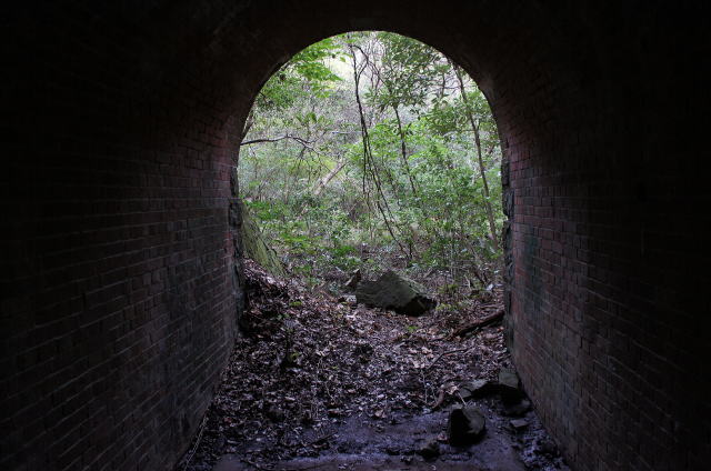 最深部より振り返り。 ここからは入口は見えません。 しかし水雷を通していた隧道とは(推測です が)驚きです。 |